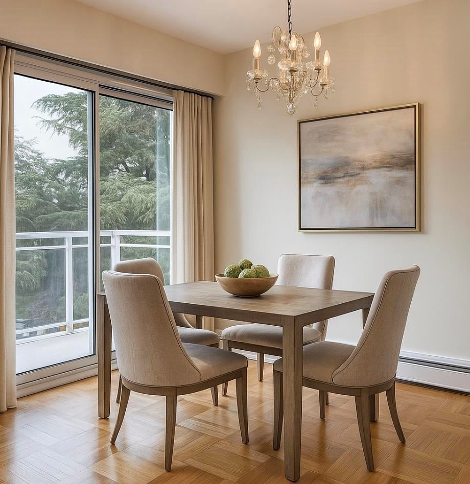 "Mansion House" - Spacious, SW facing 1 bedroom suite boasts convenience, gorgeous outlook & real privacy. This functional floor plan has lots of natural light throughout. The living room and dining room have plenty of windows with a parklike view above the outdoor pool. Kitchen has some updating and plenty of cupboard space. Very generous sized bedroom fits a king size bed and lots of closet space. Enjoy relaxing on the balcony while taking in the scenery. Shared laundry, lounge, patio & outdoor pool. Central location; close to Tisdall Park and Vandusen Gardens. Walk to Oakridge - shopping, banking, restaurants - easy access to transit Canada Line Skytrain - YVR, Richmond & downtown, UBC, Langara. Parking & storage locker. Age restricted 19+ - No pets/rentals/smoking